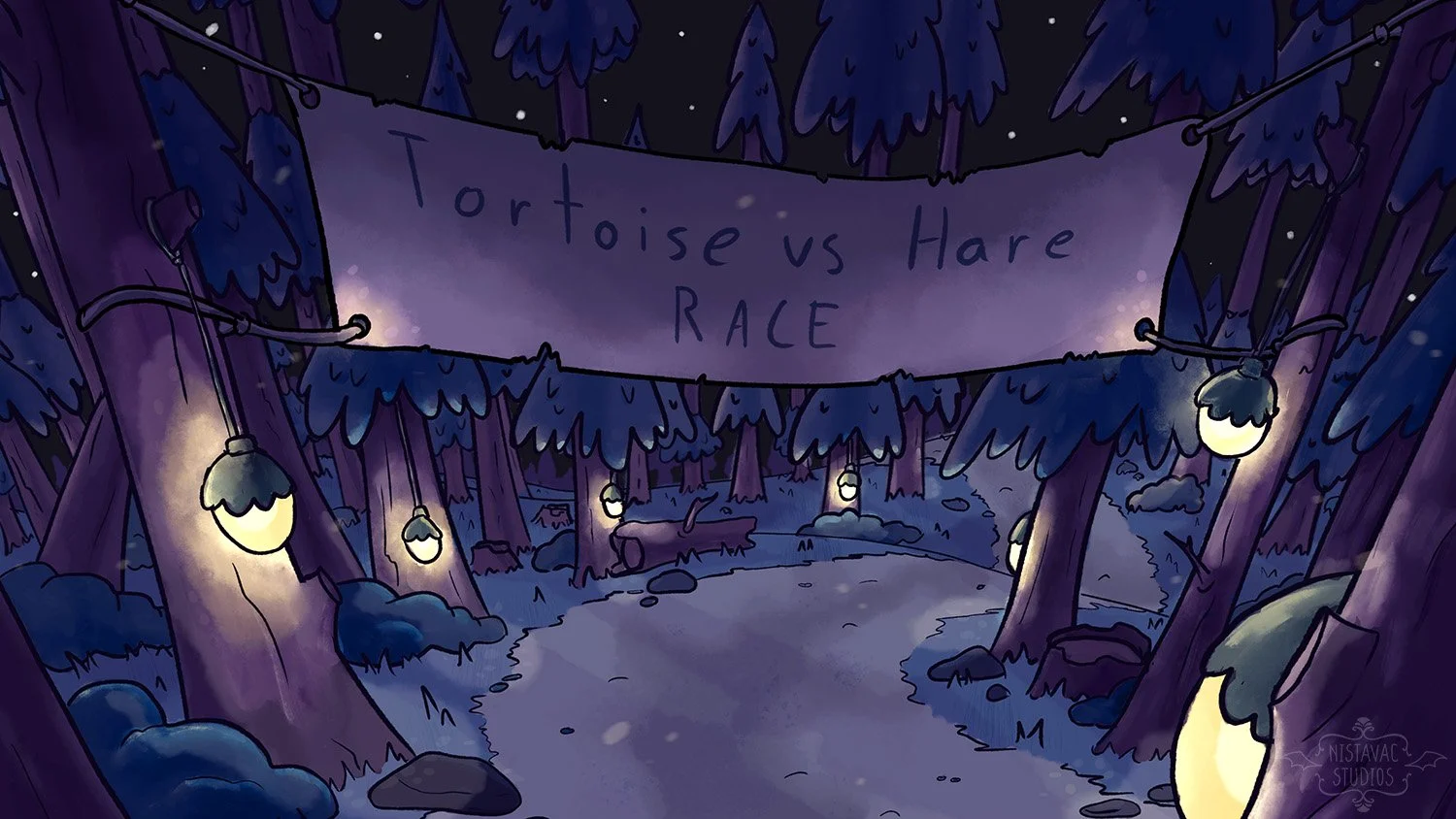 Digitally illustrated forest backgrounds for "The Big Race" that explore the scene in daytime and nighttime lighting conditions, as well as different perspectives.